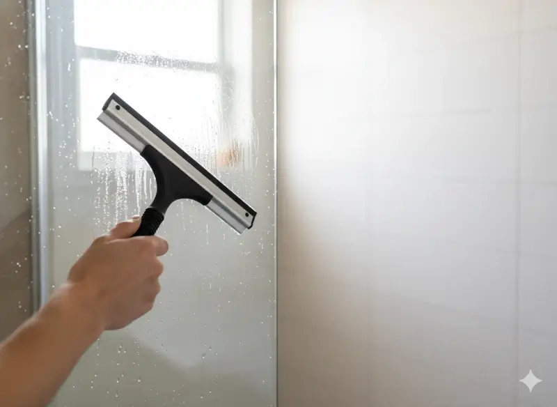 - Squeegee shower glass. Soap scum and water spots vanish if handled daily. Hang the squeegee where it’s visible as a reminder.