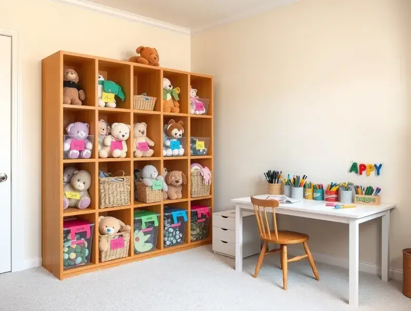 • Cube organizers with labeled bins → easy for kids to toss toys back.