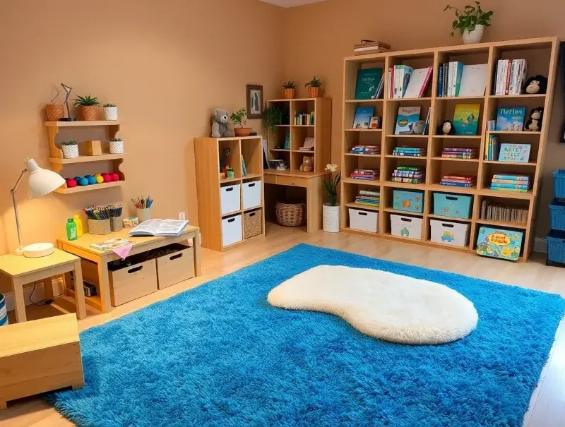 Minimalist kids’ playroom with cube organizers, labeled bins, and a clutter-free cozy rug.