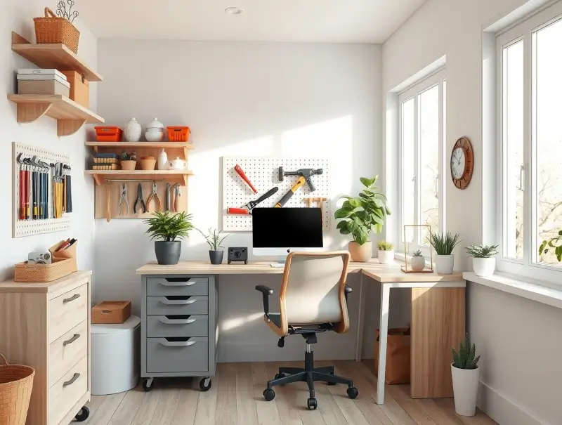 Use vertical space, floating shelves, pegboards, and slim rolling drawers. Keep the desk minimal.