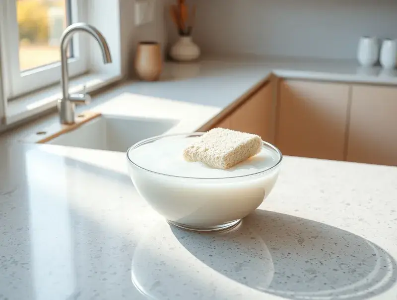 For stubborn stains (coffee, turmeric, food dye), mix baking soda with water to create a paste. Apply to the stain for 2–3 minutes, then wipe gently. Quartz is durable, so this method is safe.