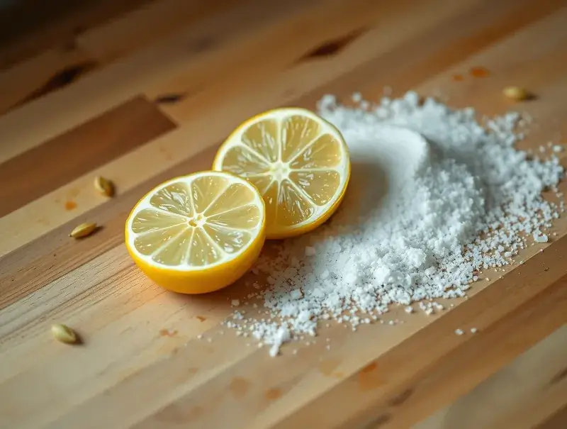 Sprinkle coarse salt on the surface and scrub with half a lemon. The lemon disinfects naturally while the salt removes stains and odors. Rinse lightly and dry immediately.