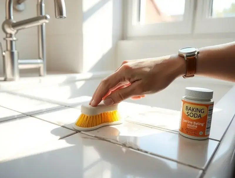 Grout collects food and moisture easily. Use baking soda paste with a toothbrush to scrub between tiles. Rinse thoroughly afterward.