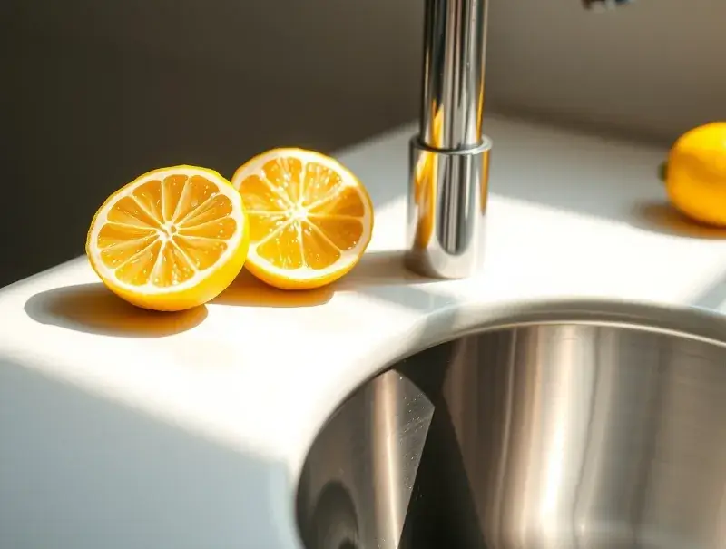 Rub half a lemon around the sink to neutralize odors and brighten the metal. For stubborn smells, spray vinegar around the basin and rinse after a few minutes.