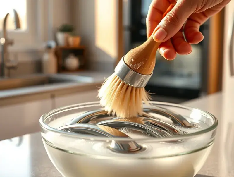 Use a mixture of warm water + dish soap or vinegar (if safe for your material). Warm water helps melt grease faster. Dip your cloth or sponge into the solution and wring out excess water.