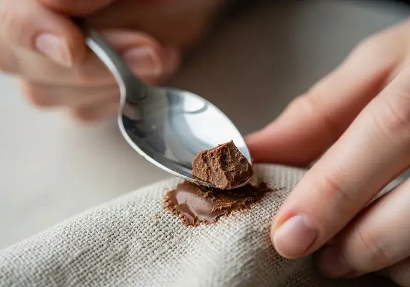 Use a spoon or the dull side of a knife to lift off as much chocolate as possible. Avoid rubbing — it spreads the stain and pushes pigment deeper into the fabric.