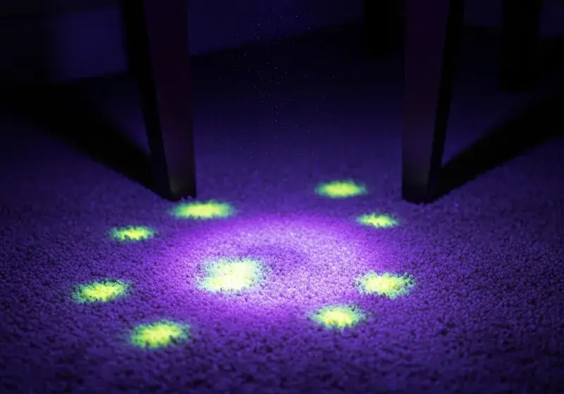 Urine glows under UV light. A blacklight can help identify old or hidden stains on carpets and walls.