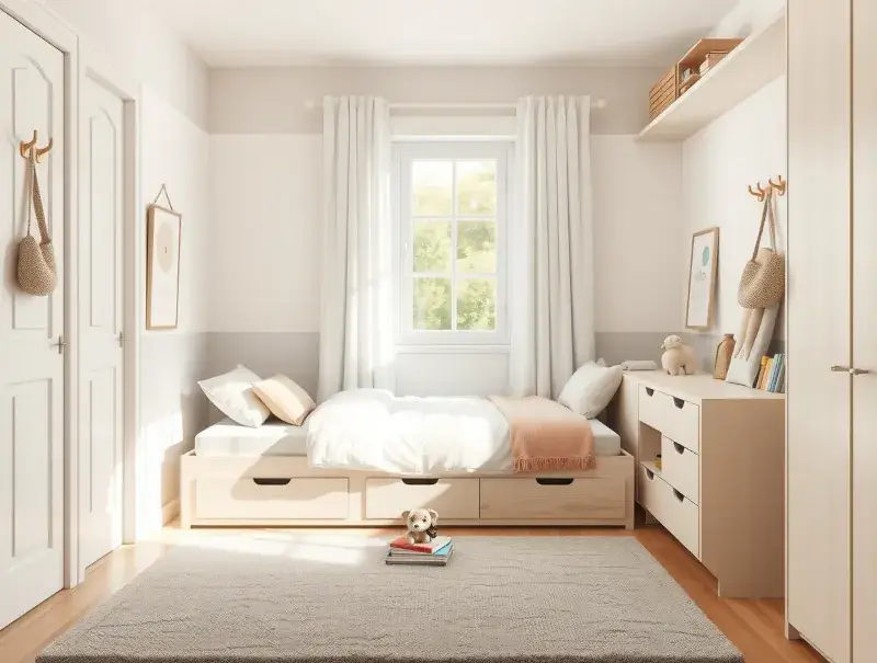 Small rooms require double-duty furniture. Beds with built-in drawers, fold-down desks, and bench seating with hidden storage maximize space. The fewer standalone items you need, the simpler the room is to maintain.