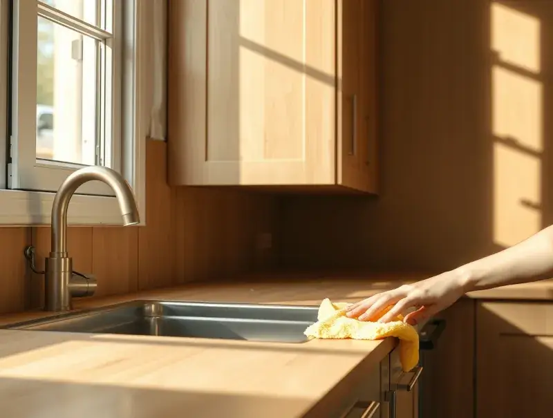 Use a microfiber cloth and a food-safe cleaner. Wipe in circular motions to remove crumbs, smudges, and grease. Keeping counters clear prevents pests and makes each cooking session easier.