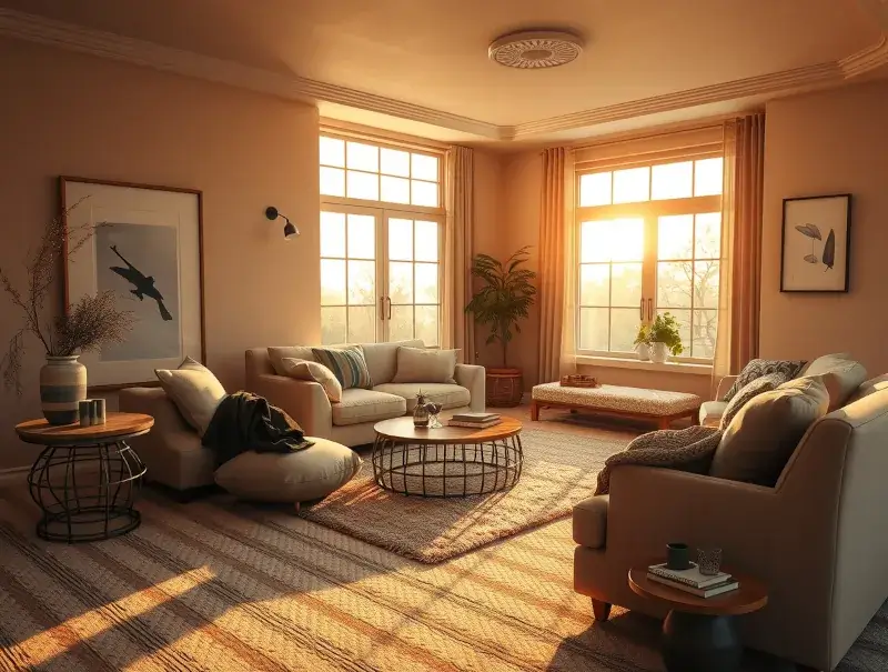 Modern cozy living room with neutral color palette and natural light.