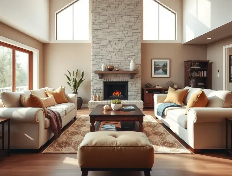 • 🔥 Fireplace focus: Two sofas or armchairs facing each other with the fireplace in between.
