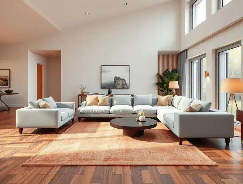 Modern cozy living room layout with sofa and rug arranged for comfort and balance.