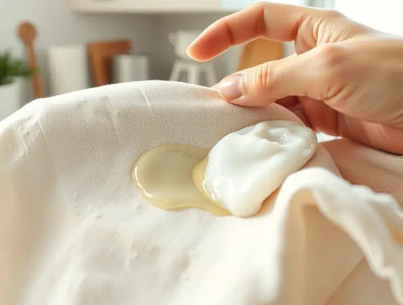Protein stains are extremely sensitive to heat. Use cold water only — hot water cooks the protein and makes the stain permanent. Soak fresh stains in cold water for 10–20 minutes to loosen the organic material. For older or dried stains, apply an enzyme cleaner or a small amount of hydrogen peroxide (for white fabrics only) to break up the protein bonds. Gently rub the cleaner into the fibers and rinse thoroughly before washing. These stains often lighten gradually rather than disappearing instantly.